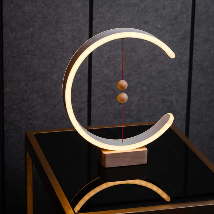Un design captivant : Le luminaire, en forme de demi-lune, est subtilement suspendu au-dessus d'un socle en bois rectangulaire stable. Ses interrupteurs magnétiques, presque invisibles, ajoutent une touche de magie et de modernité.