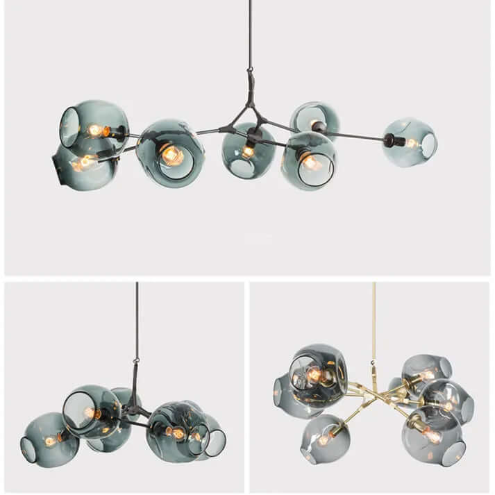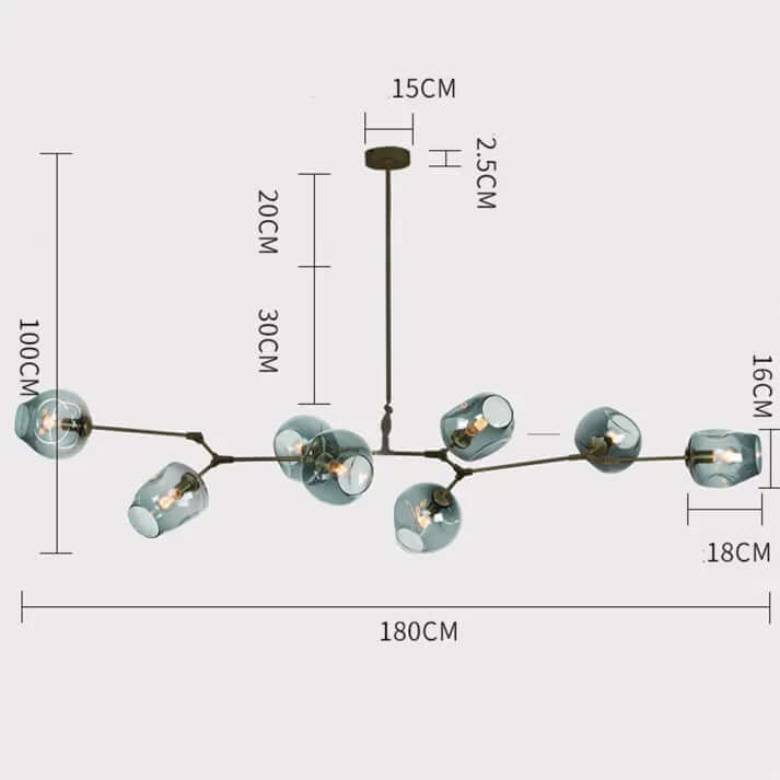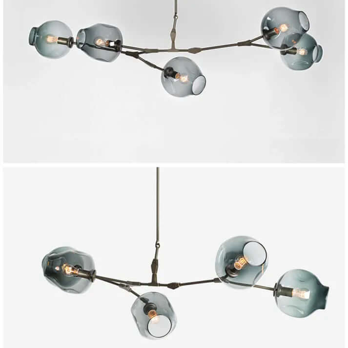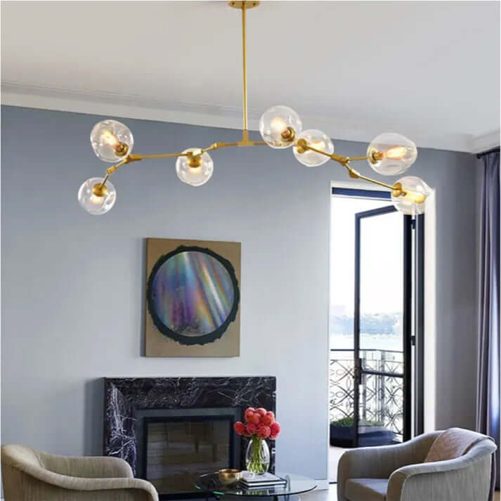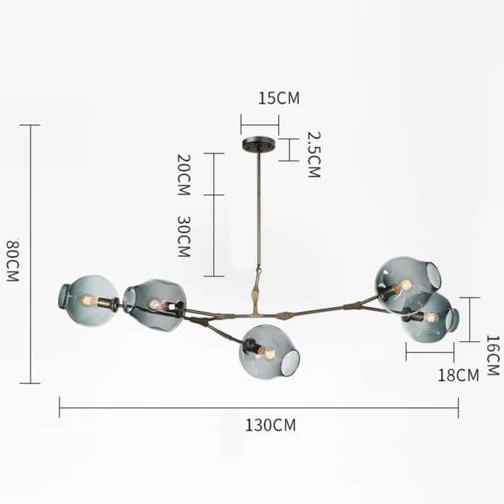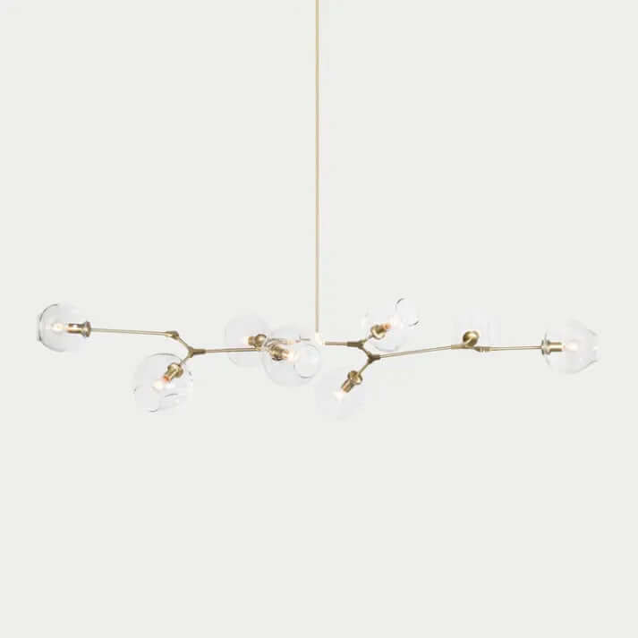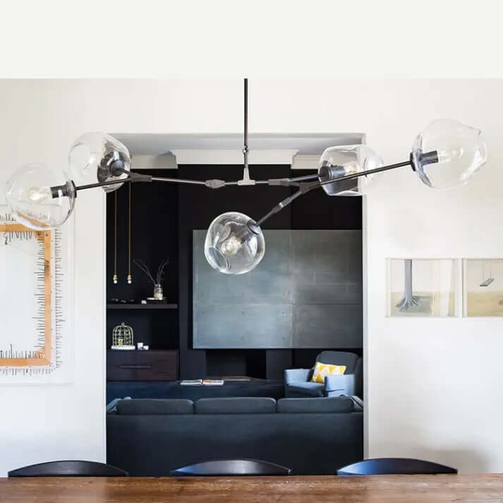 Ce lustre suspension, véritable pièce maîtresse, allie l'esthétique du milieu du siècle à un design contemporain. Ses bras ramifiés et ses orbes en verre bulle diffusent une lumière douce et ambiante, parfaite pour créer une atmosphère relaxante dans votre salon, salle à manger ou entrée.