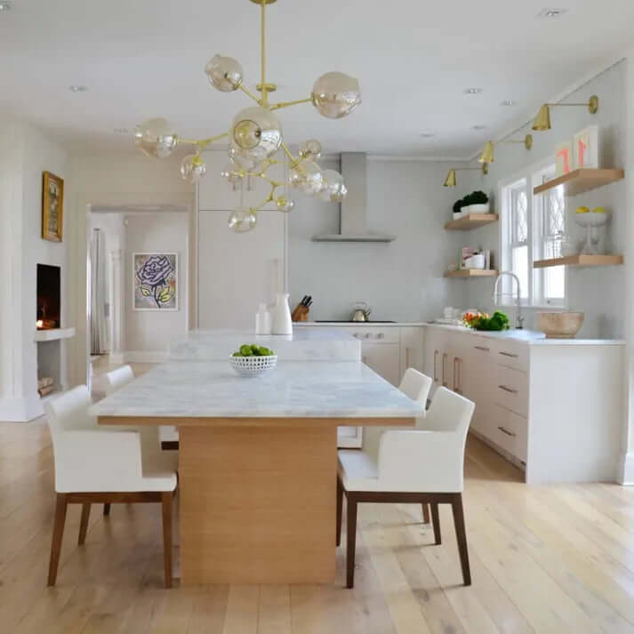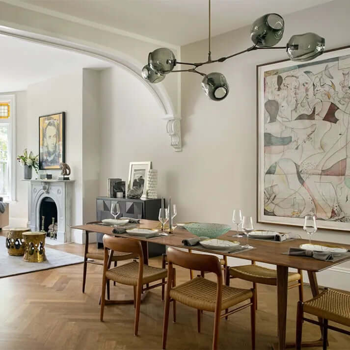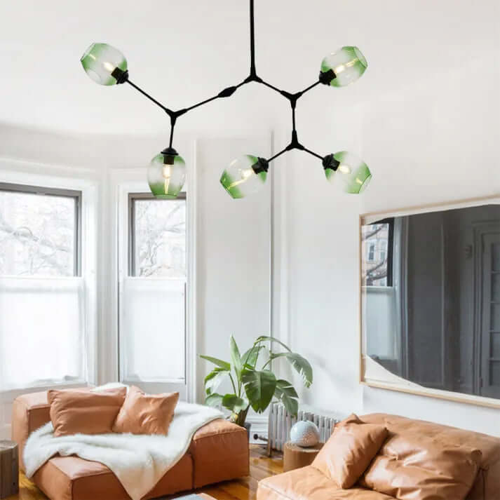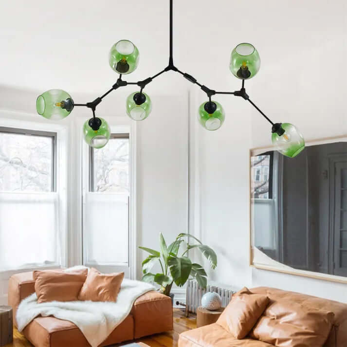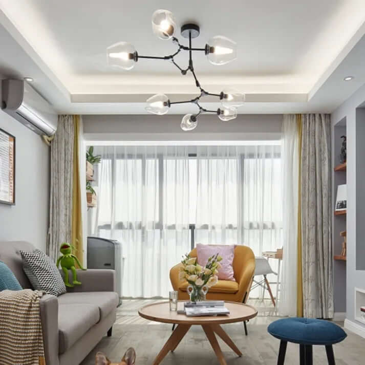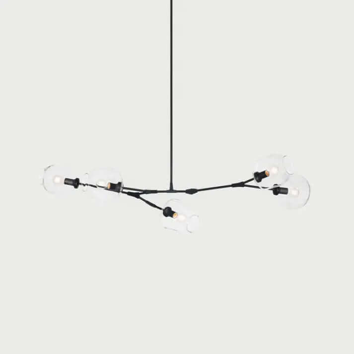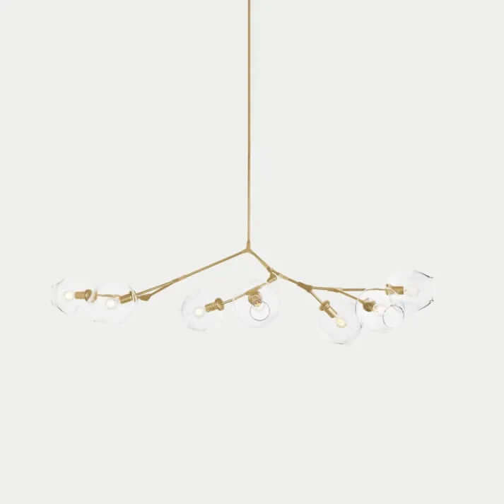 Ce lustre suspension, véritable pièce maîtresse, allie l'esthétique du milieu du siècle à un design contemporain. Ses bras ramifiés et ses orbes en verre bulle diffusent une lumière douce et ambiante, parfaite pour créer une atmosphère relaxante dans votre salon, salle à manger ou entrée.
