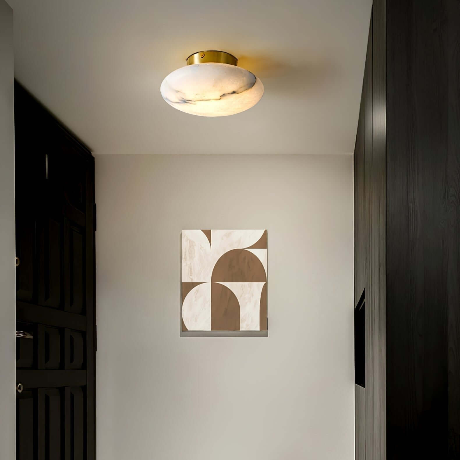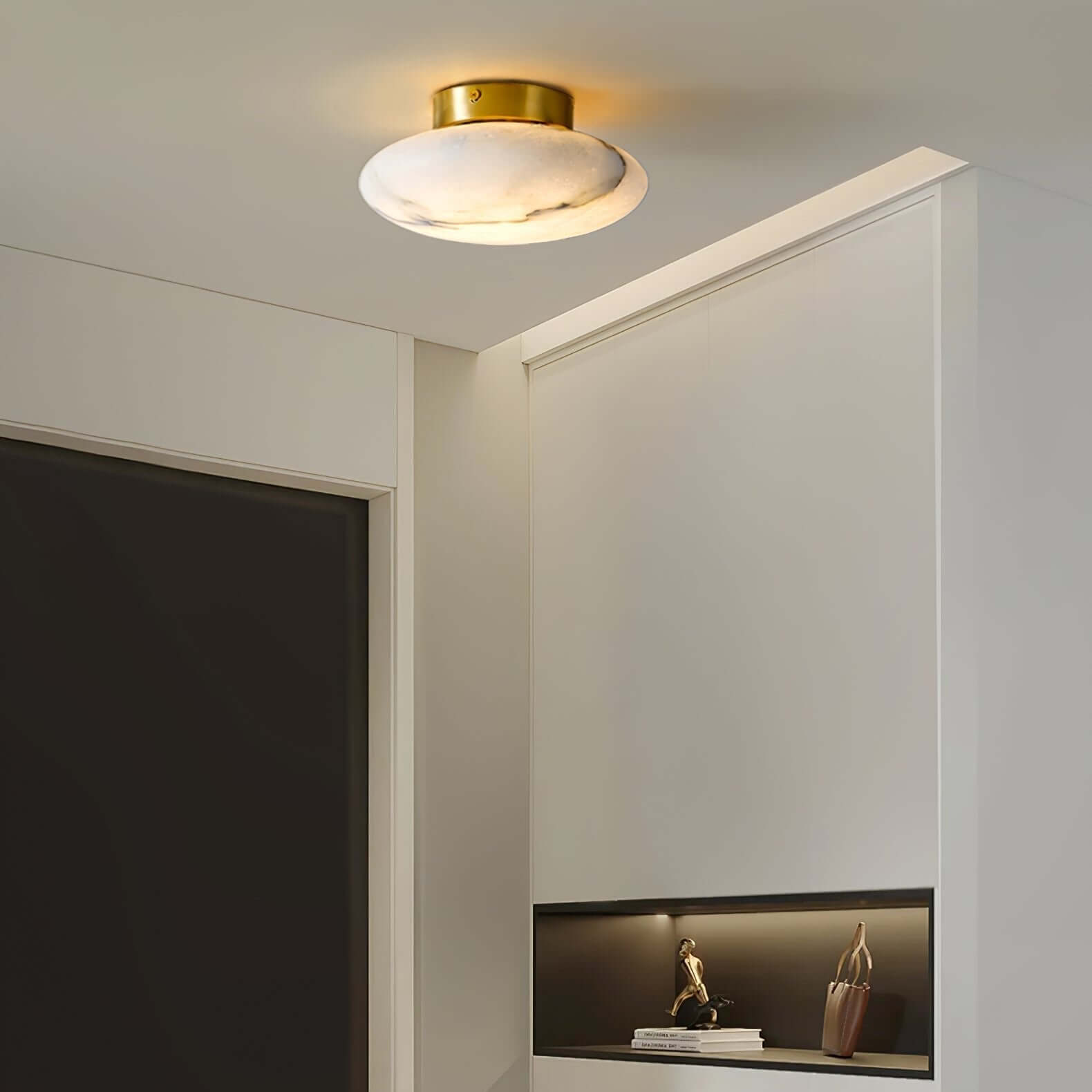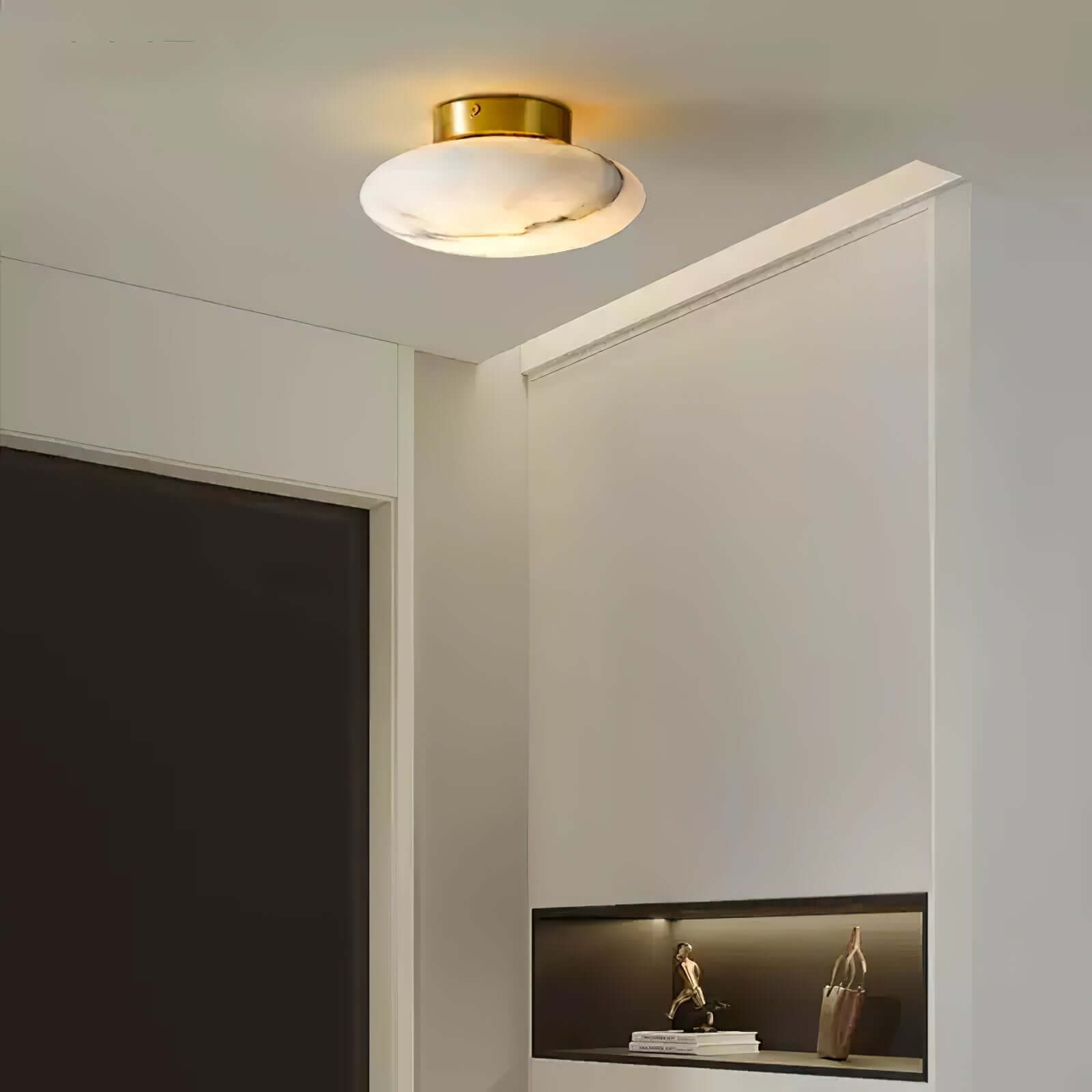 Ce plafonnier se distingue par son design minimaliste et épuré, s'intégrant parfaitement à tous les styles d'intérieur. L'albâtre véritable laisse passer une lumière douce et tamisée, créant une atmosphère relaxante et apaisante.