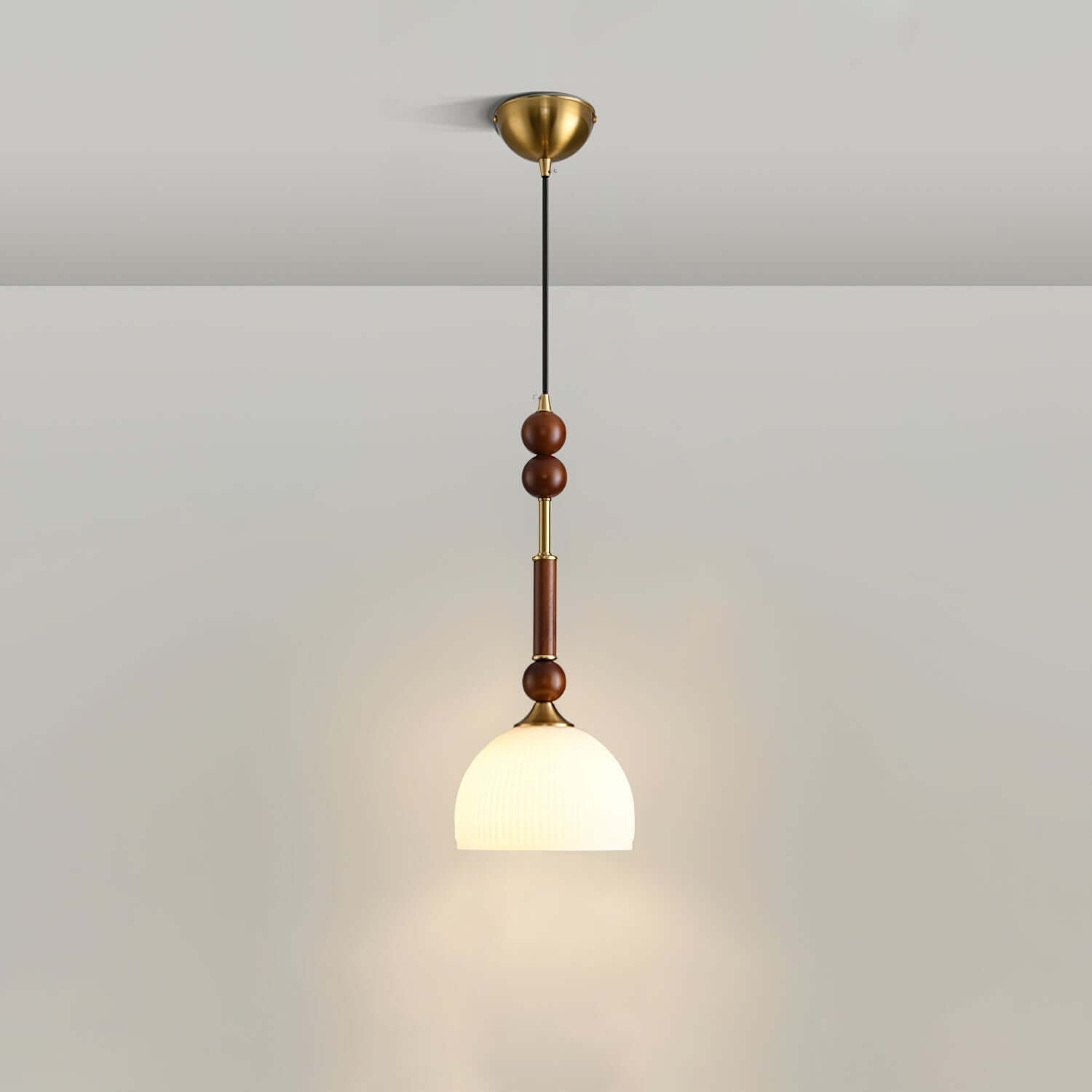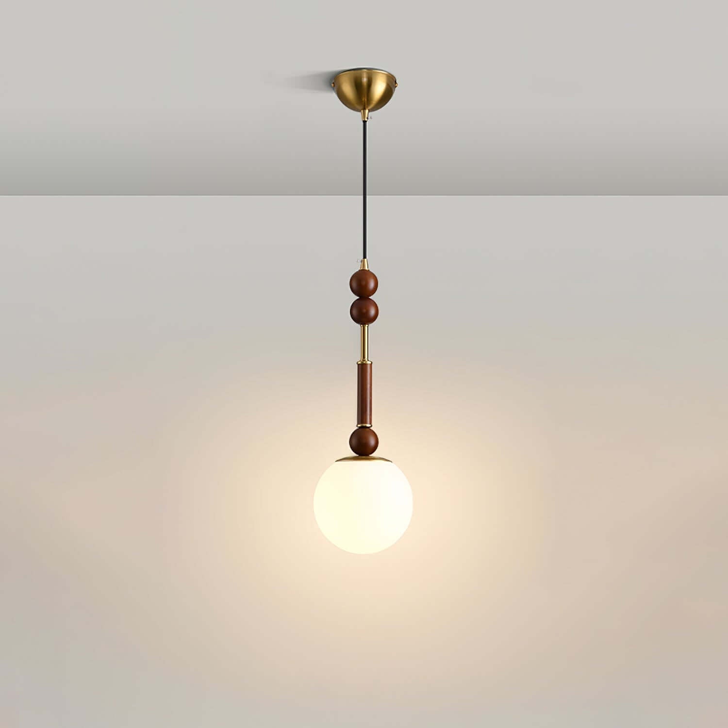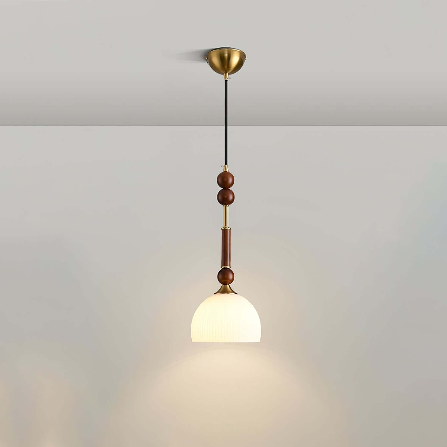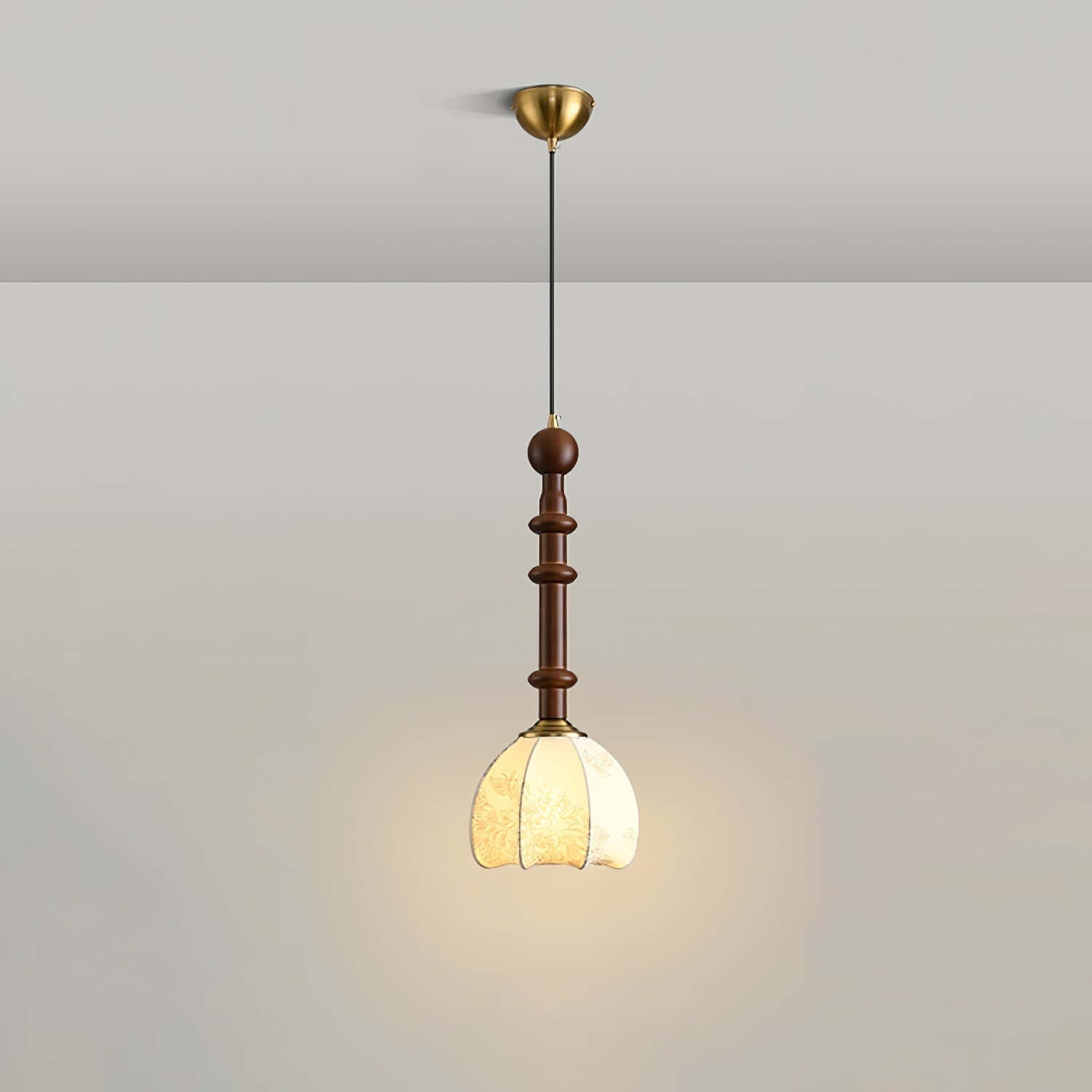 Cette suspension allie subtilement le bois, le métal et le verre pour créer une ambiance chaleureuse et raffinée. La lumière douce diffusée par l'abat-jour en verre évoque le charme des intérieurs européens classiques.