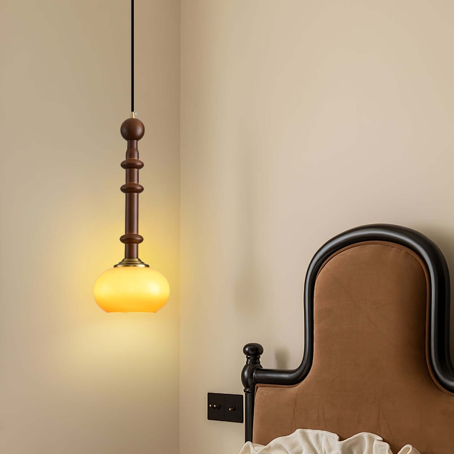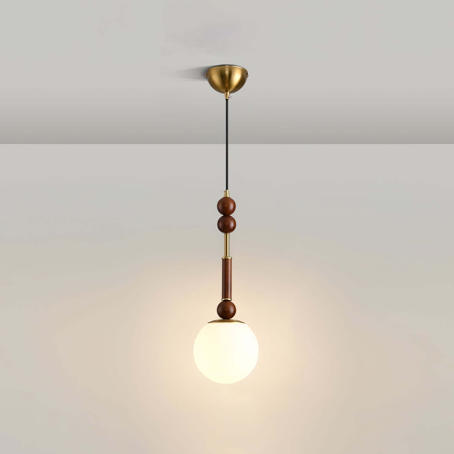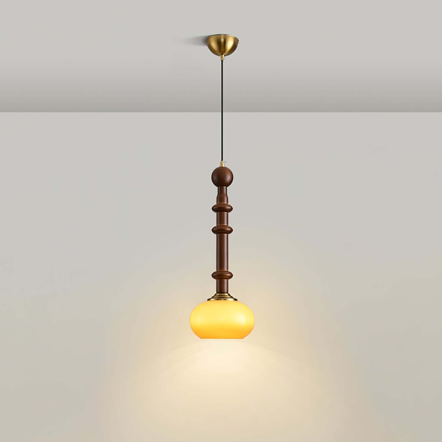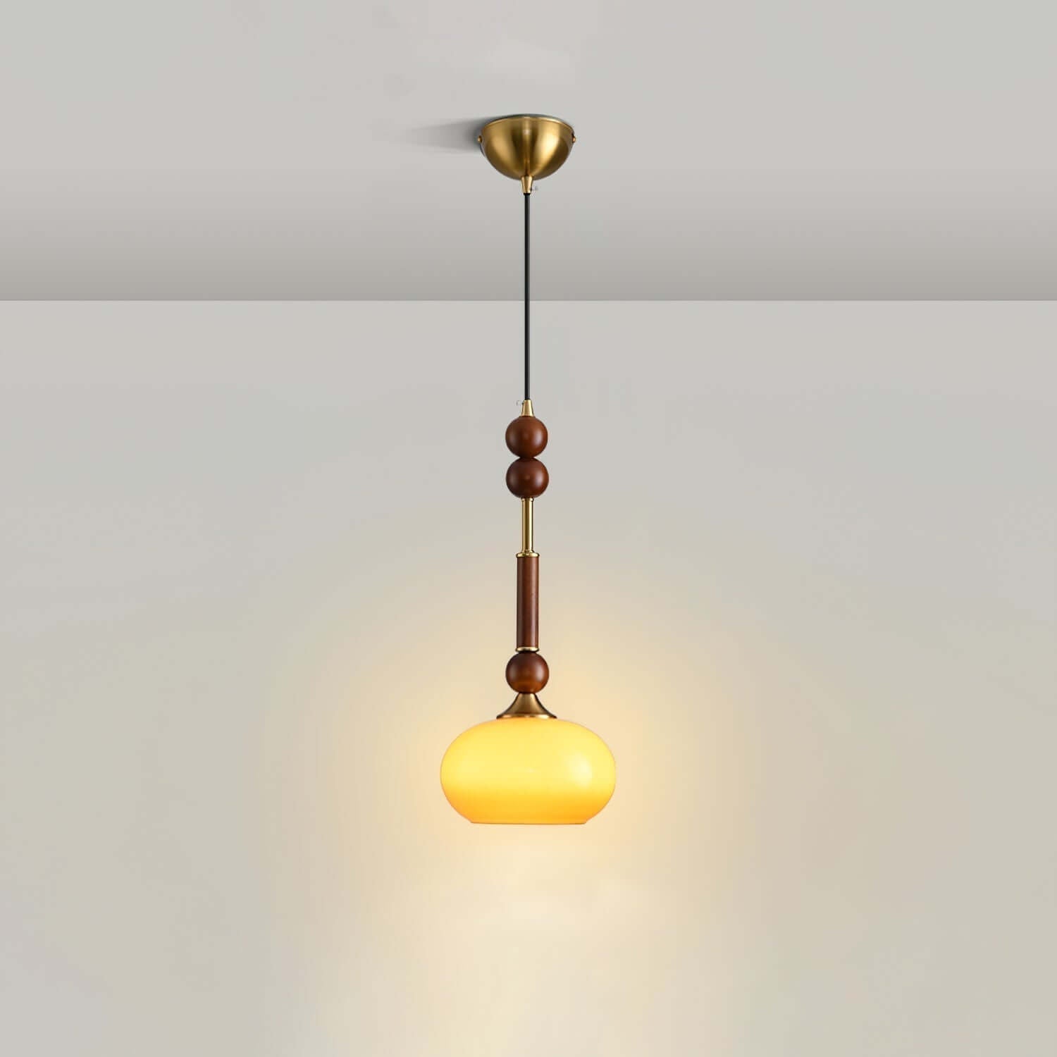 Cette suspension allie subtilement le bois, le métal et le verre pour créer une ambiance chaleureuse et raffinée. La lumière douce diffusée par l'abat-jour en verre évoque le charme des intérieurs européens classiques.