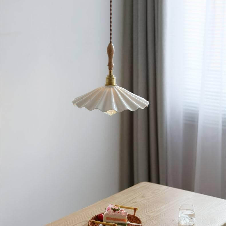 Cette suspension se distingue par son abat-jour en céramique cannelée, créant un jeu de lumière subtil et raffiné. Le cordon torsadé en tissu et le support en bois ajoutent une touche d'authenticité et de charme.
