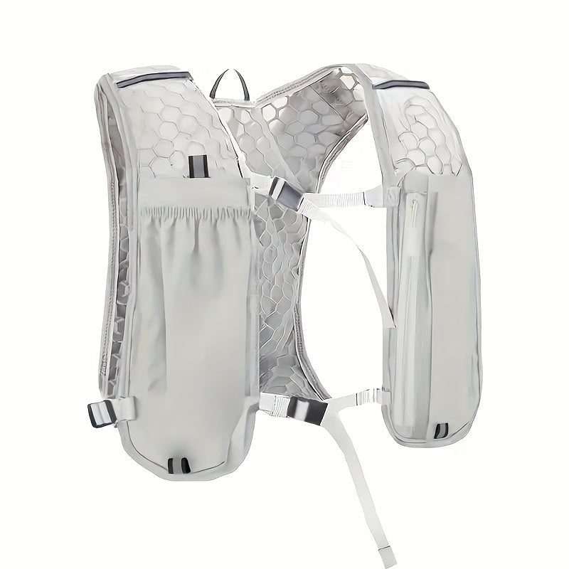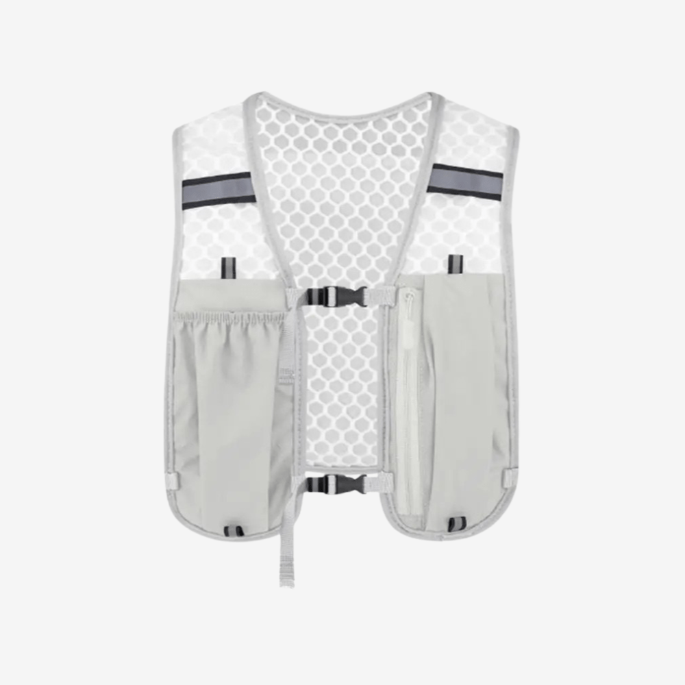 "Gilet de sport respirant unisexe gris avec poches pratiques, bretelles réglables; idéal pour course et randonnée."