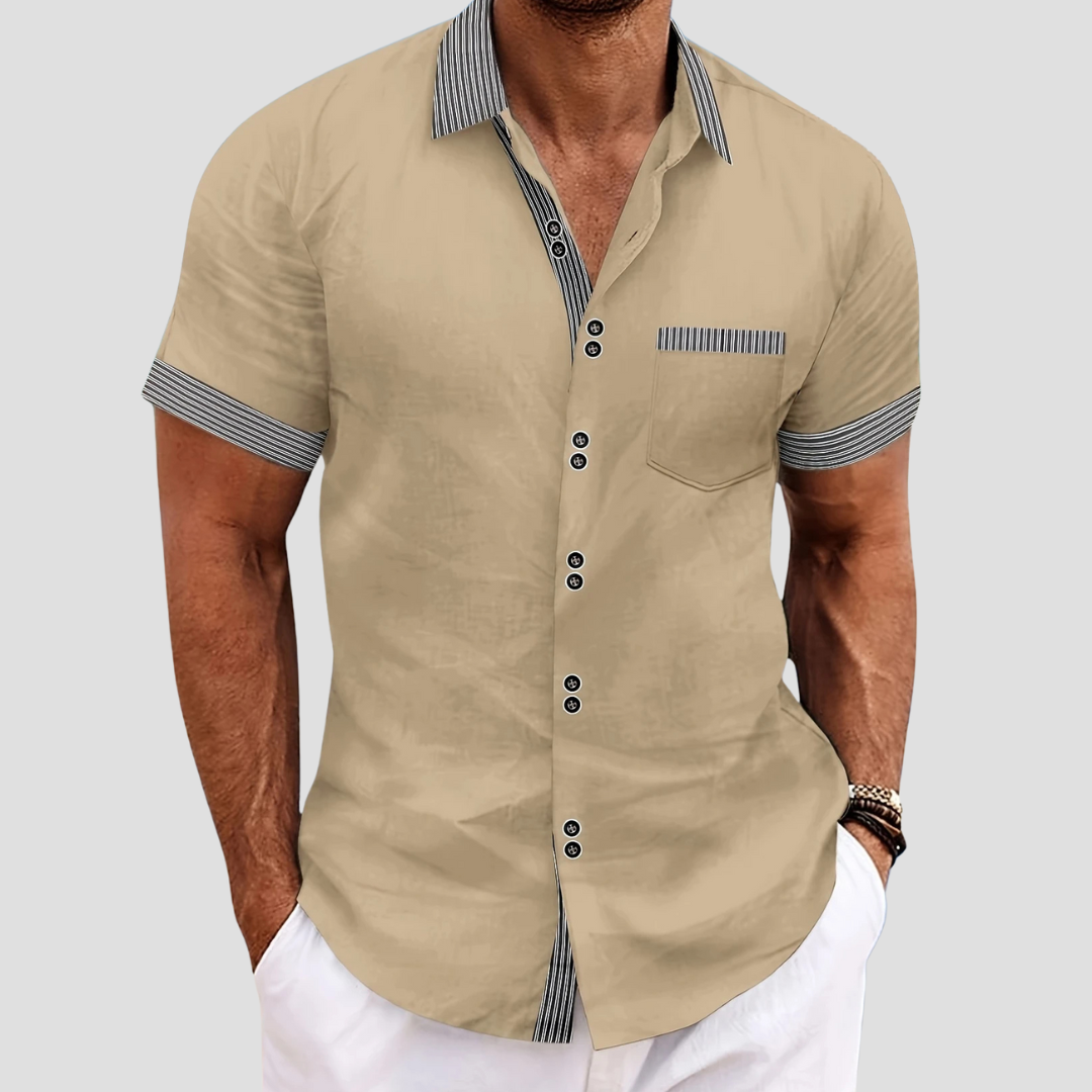 "Chemise été homme décontractée en coton, manches courtes contrastées, allure chic et confortable pour style estival"